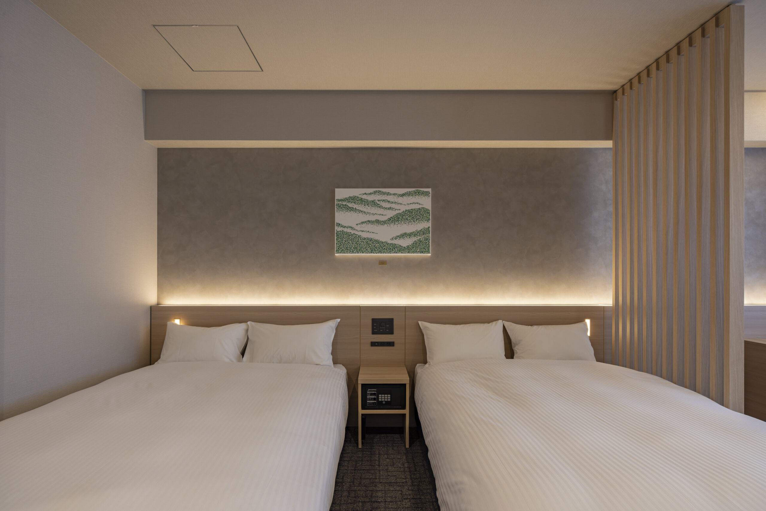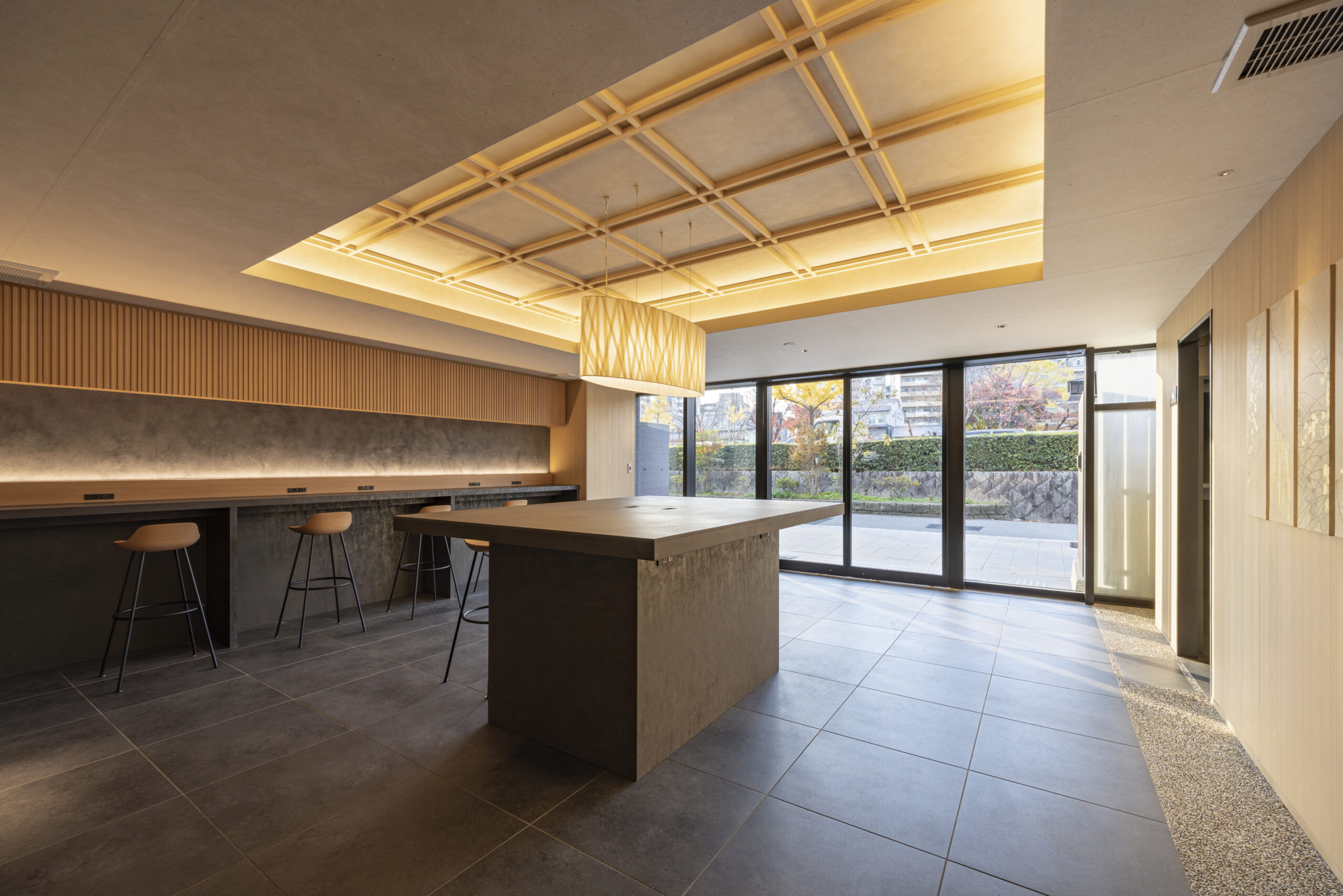 ロビー、廊下の照明には、和の素材感と調和する製作照明を採用しました。柔らかな光が壁面に陰影をもたらし、空間に独自の表情と温かみを添えています。