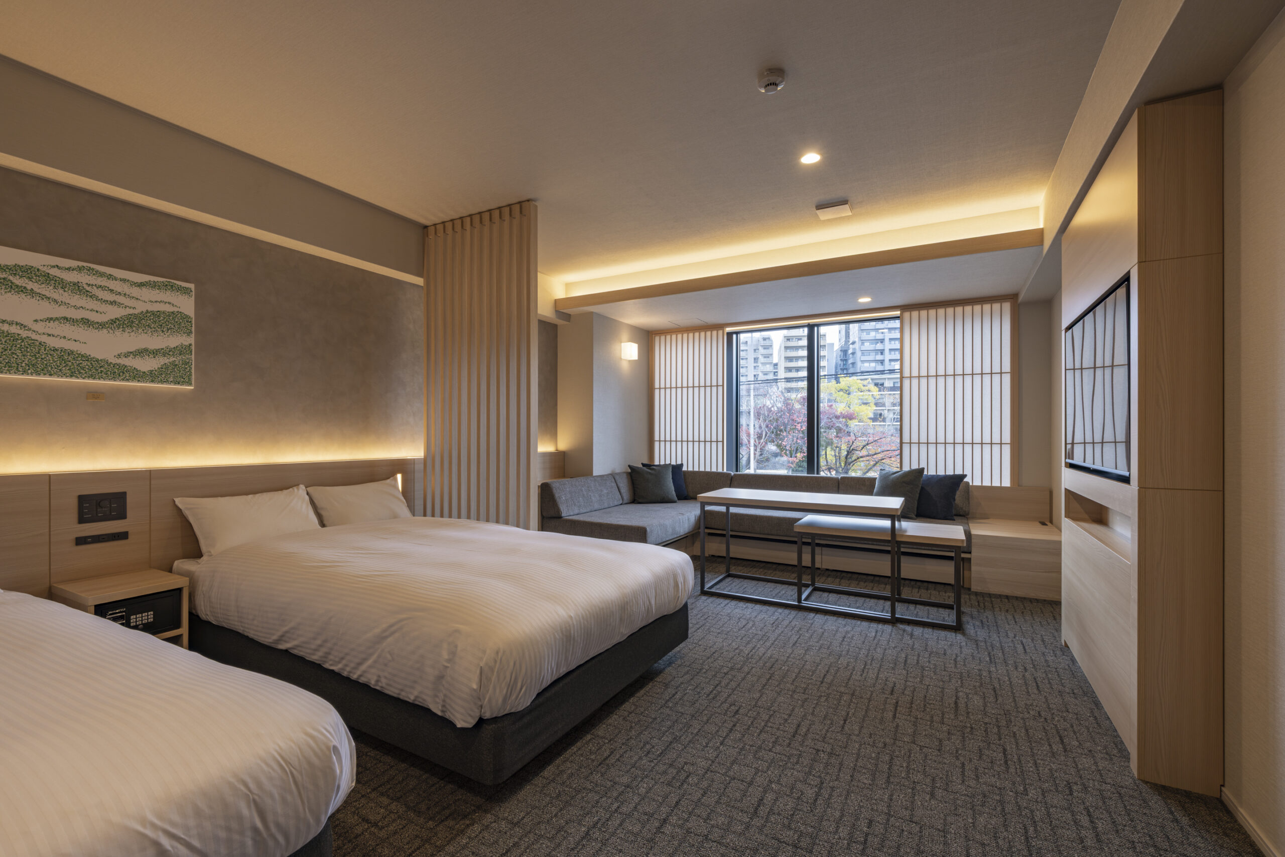 客室は1室あたり5~6名での利用を想定しました。白木系の木目を基調に、障子や木格子を組み合わせることで、落ち着きと温もりのある和の空間を構成しています。